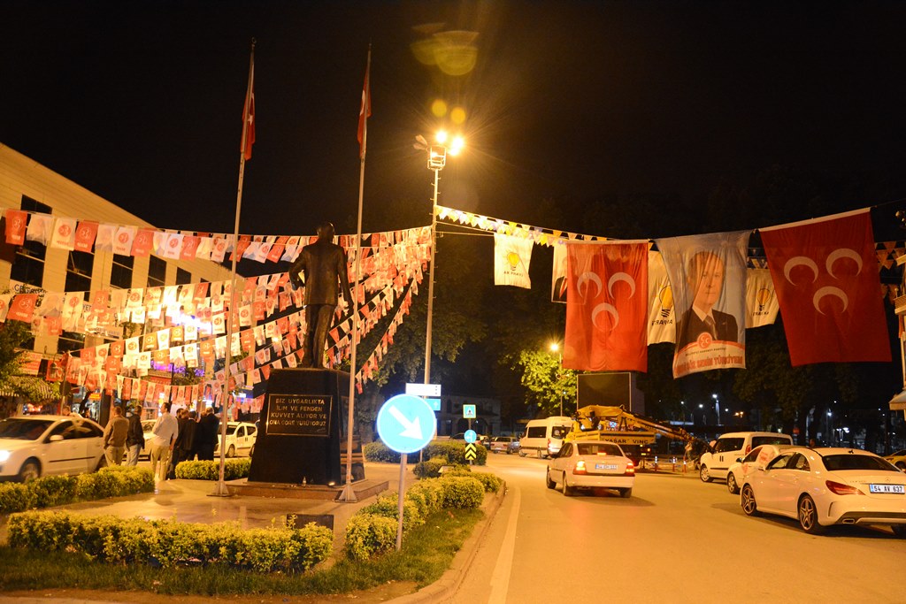 MHP İlçe teşkilatının şikayetleri karşısında AKP Bayrakları indirilmeyince partililer ellerinde bayraklarla Cumhuriyet alanına gelerek gece yarısı Meydanı gelin gibi süsledi.
